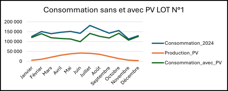 Évolution mensuelle de la consommation électrique avec et sans production photovoltaïque – Lot n°1- Bâtiment 25